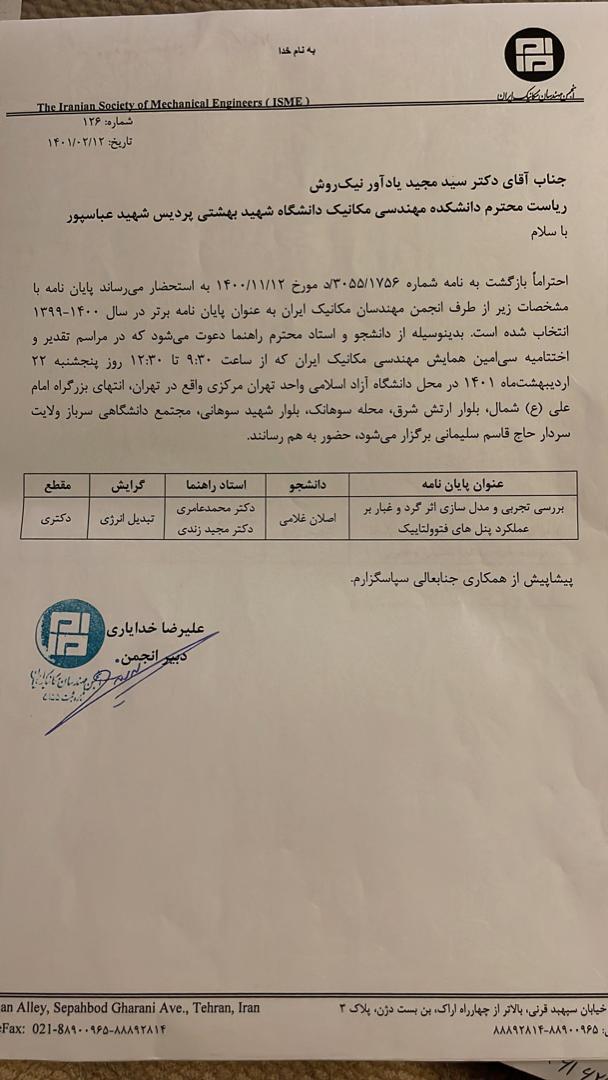 پایاننامه آقای دکتر اصلان غلامی دانشجوی مقطع دکتری دانشکده مهندسی مکانیک و انرژی با عنوان "بررسی تجربی و مدلسازی اثر گرد و غبار بر عملکرد پنلهای فتوولتاییک" و راهنمایی آقایان دکتر محمد عامری و دکتر مجید زندی بهعنوان پایاننامه برتر سال 1400-1399 از طرف انجمن مهندسان مکانیک ایران انتخاب شد.