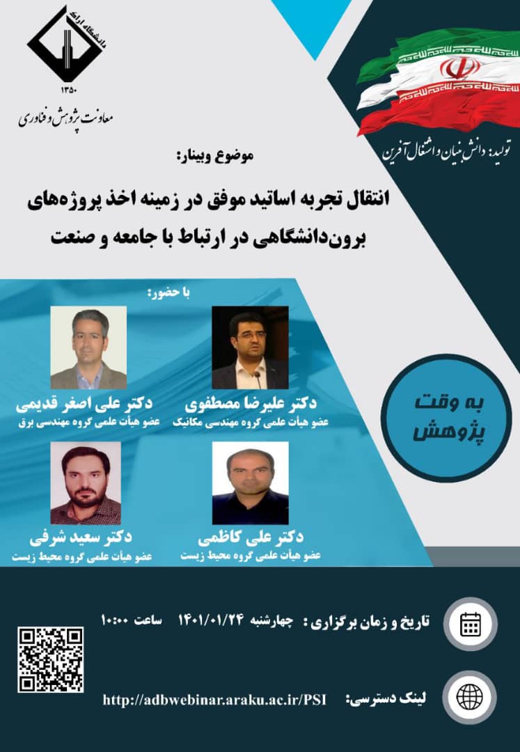 دانشگاه اراک وبینار انتقال تجربه اساتید موفق در زمینه اخذ پروژه های برون دانشگاهی در ارتباط با جامعه و صنعت با سخنرانی اساتید موفق در این حوزه در سال‌های اخیر را در روز چهارشنبه 1401/1/24 ساعت 10 صبح برگزار می نماید.