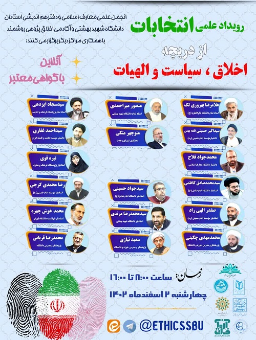 رویداد علمی انتخابات از دریچه اخلاق، سیاست و الهیات؛ چهارشنبه 2 اسفندماه 1402 در دانشگاه شهید بهشتی برگزار میشود.